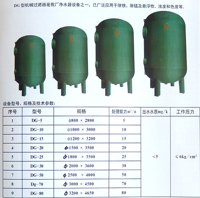 DG型机械过滤器是我厂净水器设备之一,已广泛应用于除铁、除锰及除悬浮物、浊度和色度等。 内置滤料有石英砂、锰砂、多介质滤料等滤料,根据进出水水质进行配备。