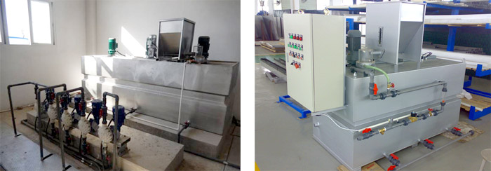 箱体由304不锈钢材料制成,分为三格,即制备格、熟化格和投配格,前两格装有1个电动搅拌器,便于充分混和药液。在投配格中装有液位计,检测高高、高、低和低低液位,保证整个系统不间断供药。在制备格上还有一个混合器,起到浸润药剂的作用。