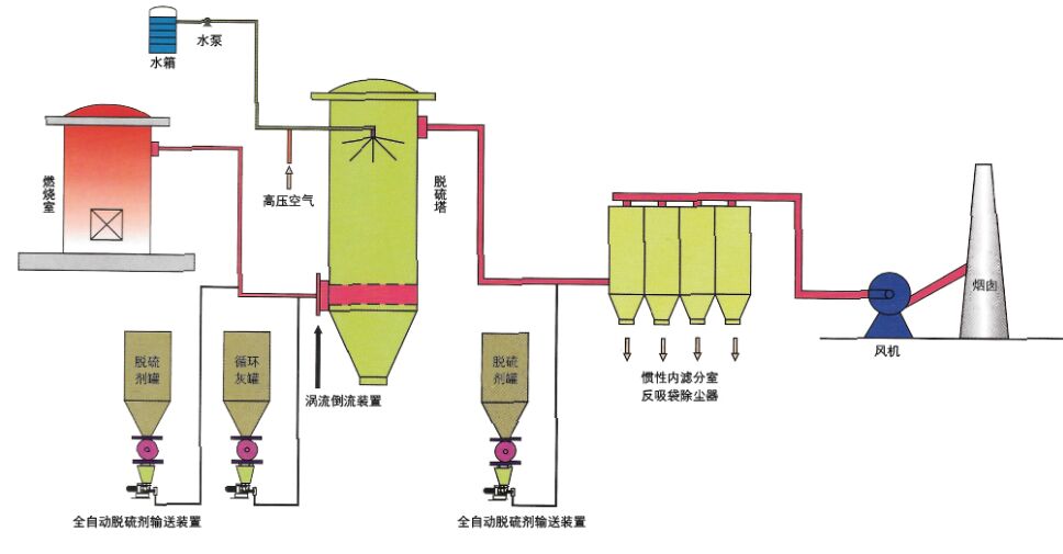 本工艺采用先进的半干法脱硫技术,以氢氧化钙作为脱硫剂,通过塔内喷淋系统加湿脱硫剂,在塔内形成氢氧化钙饱和溶液,不断地与二氧化硫等有害气体反应,从而除去二氧化硫等有害气体。同时在惯性内滤分室反吸袋除尘器的布袋内喷涂脱硫剂,充分利用其优化的结构和特殊性能进行二次脱硫。脱硫除尘净化后的气体通过箱室上面的排气管,由主风机排出。